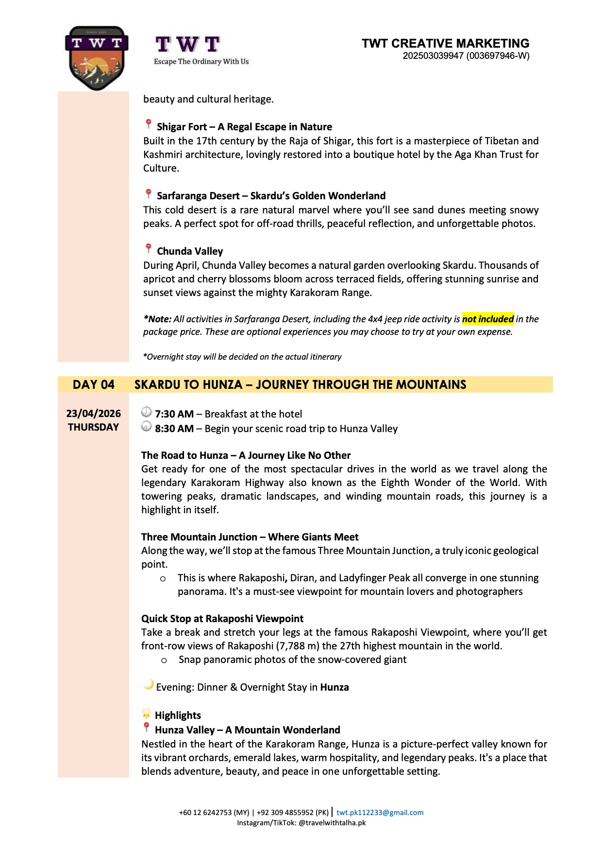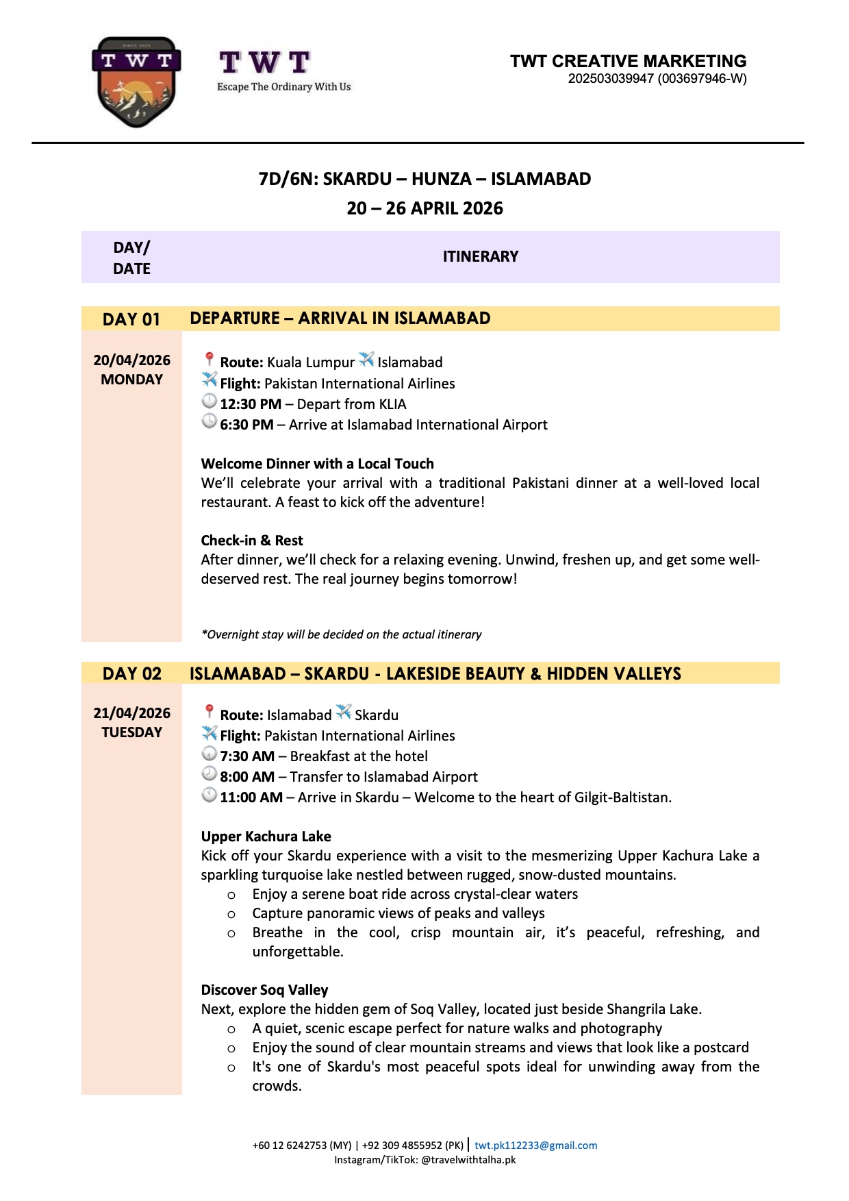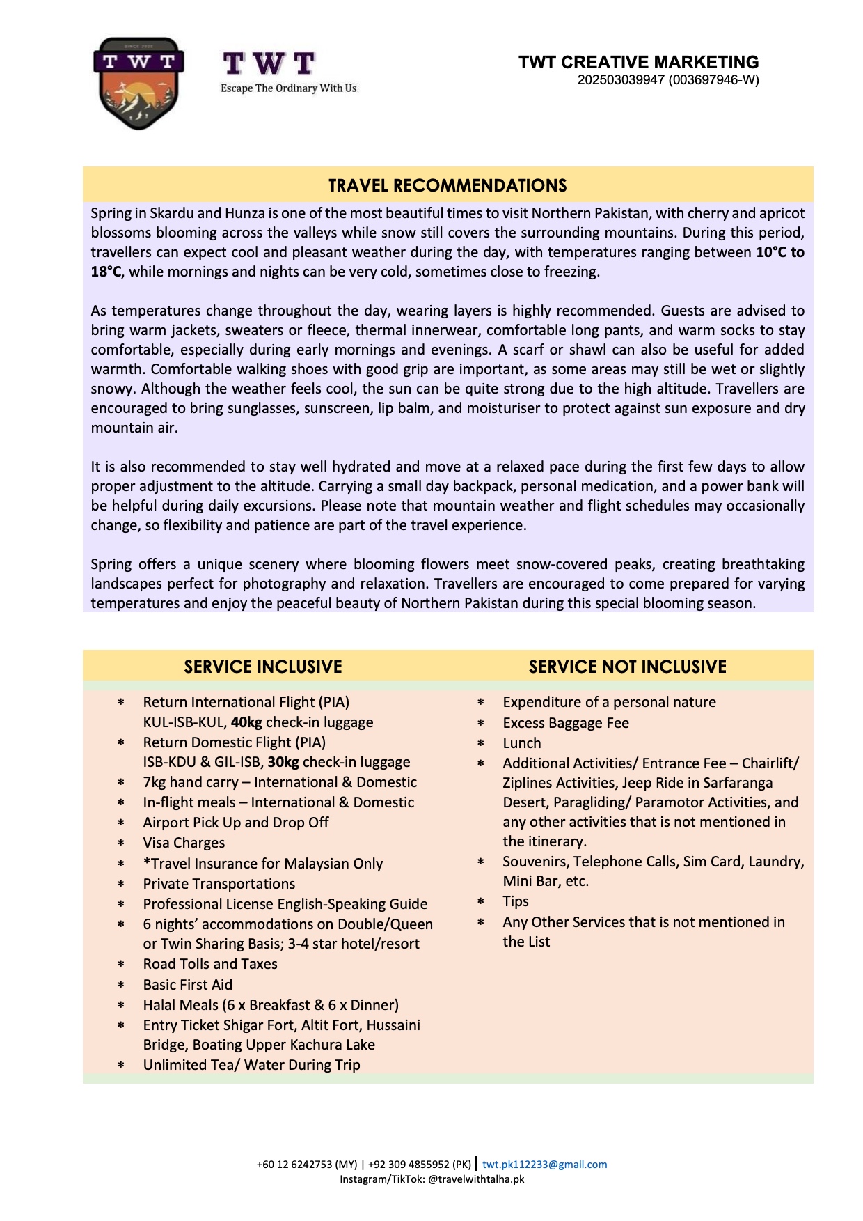2. Services Included: The package includes international flight tickets, one way domestic flight, travel insurance (for Malaysian residents), visa application, 6 nights’ stay, an English-speaking tour guide, transportation, driver, tolls, petrol, meals (breakfast, lunch and dinner), entry tickets for Shigar Fort and Altit Fort, boat rides in Upper Kachura Lake and Attabad Lake, and jeep rides in Naltar Valley as per the itinerary.
