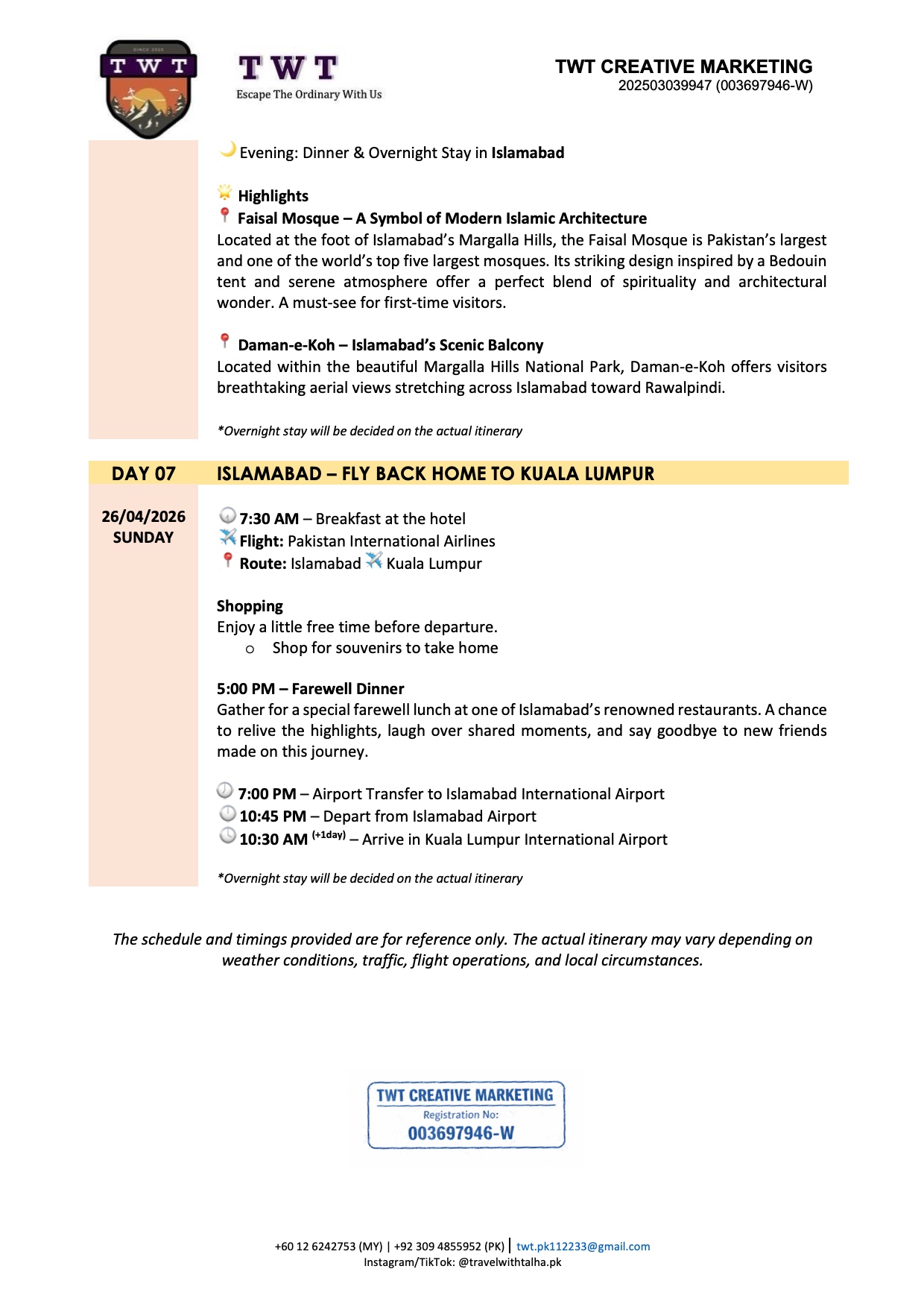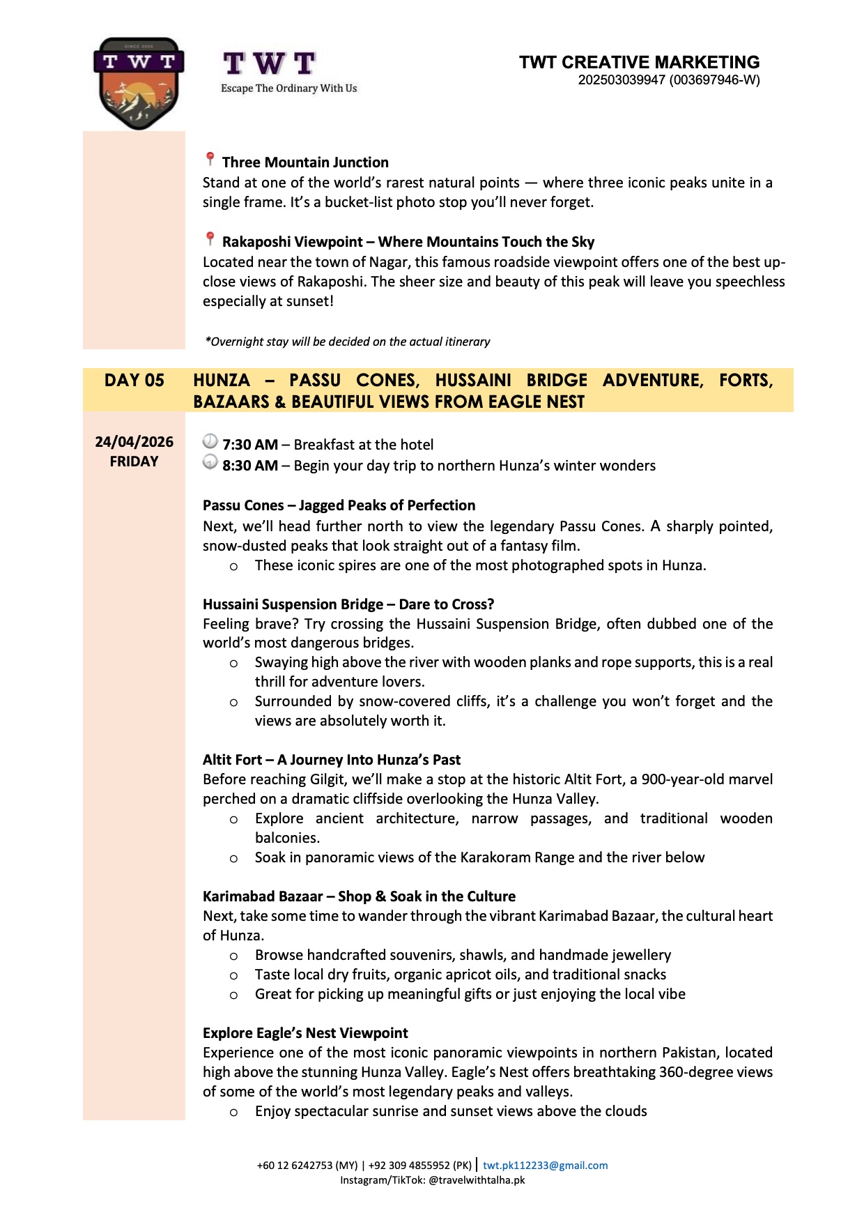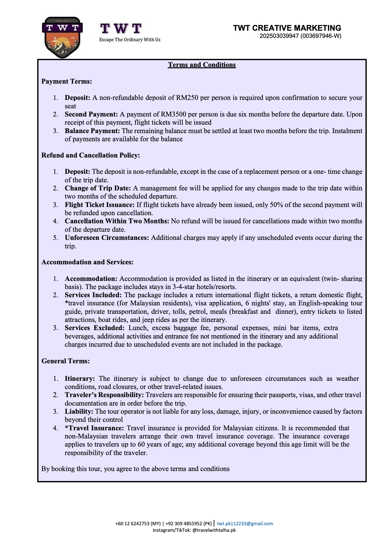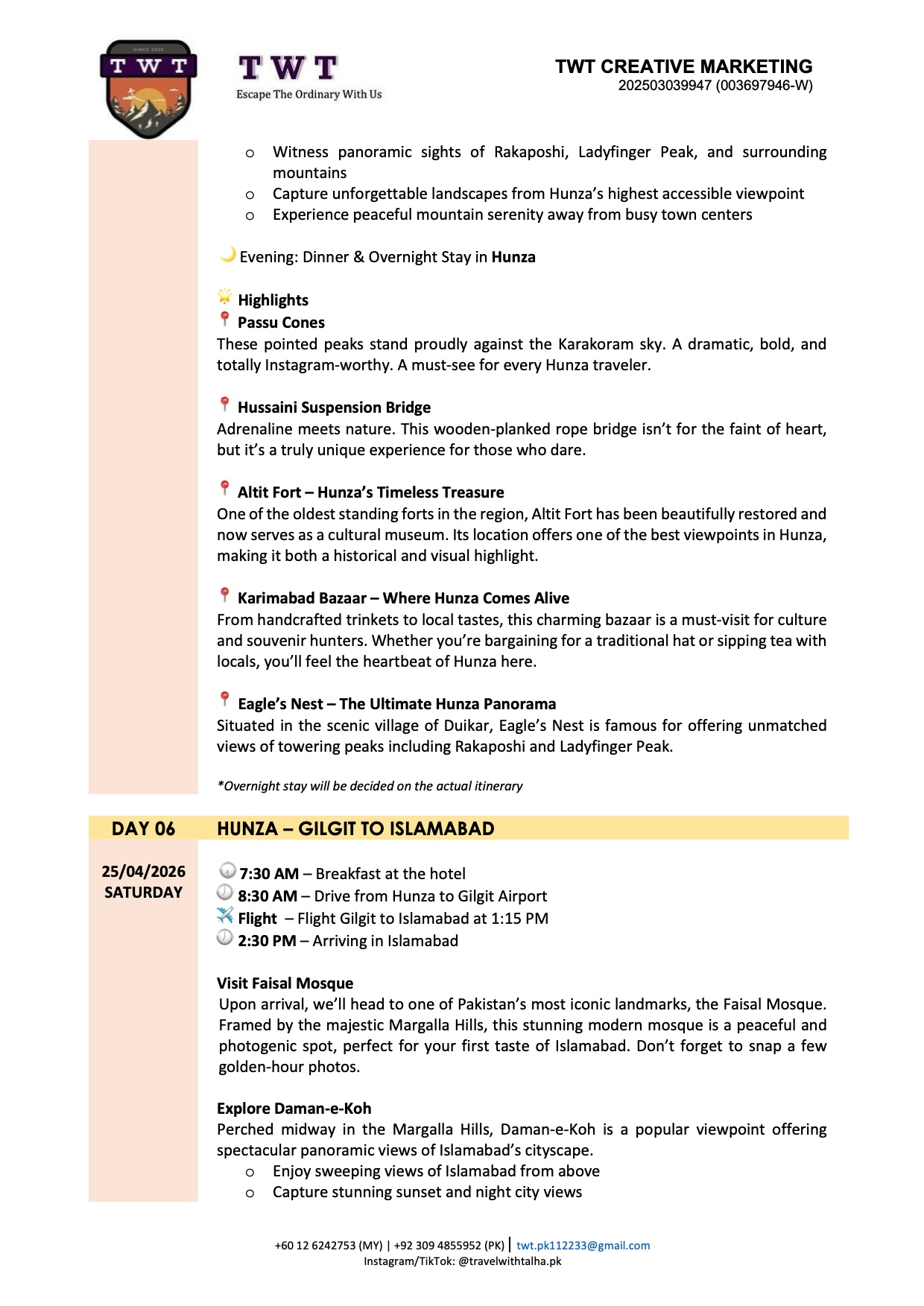 2. Services Included: The package includes international flight tickets, one way domestic flight, travel insurance (for Malaysian residents), visa application, 6 nights’ stay, an English-speaking tour guide, transportation, driver, tolls, petrol, meals (breakfast, lunch and dinner), entry tickets for Shigar Fort and Altit Fort, boat rides in Upper Kachura Lake and Attabad Lake, and jeep rides in Naltar Valley as per the itinerary.